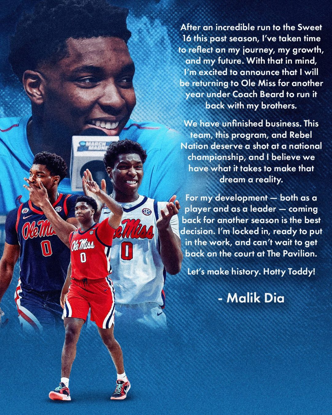 Ole Miss F/C Malik Dia announced on his IG that he will be returning to Ole Miss next season.